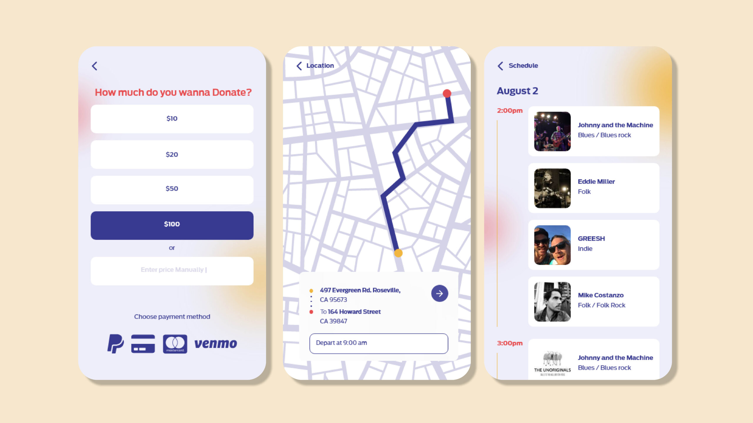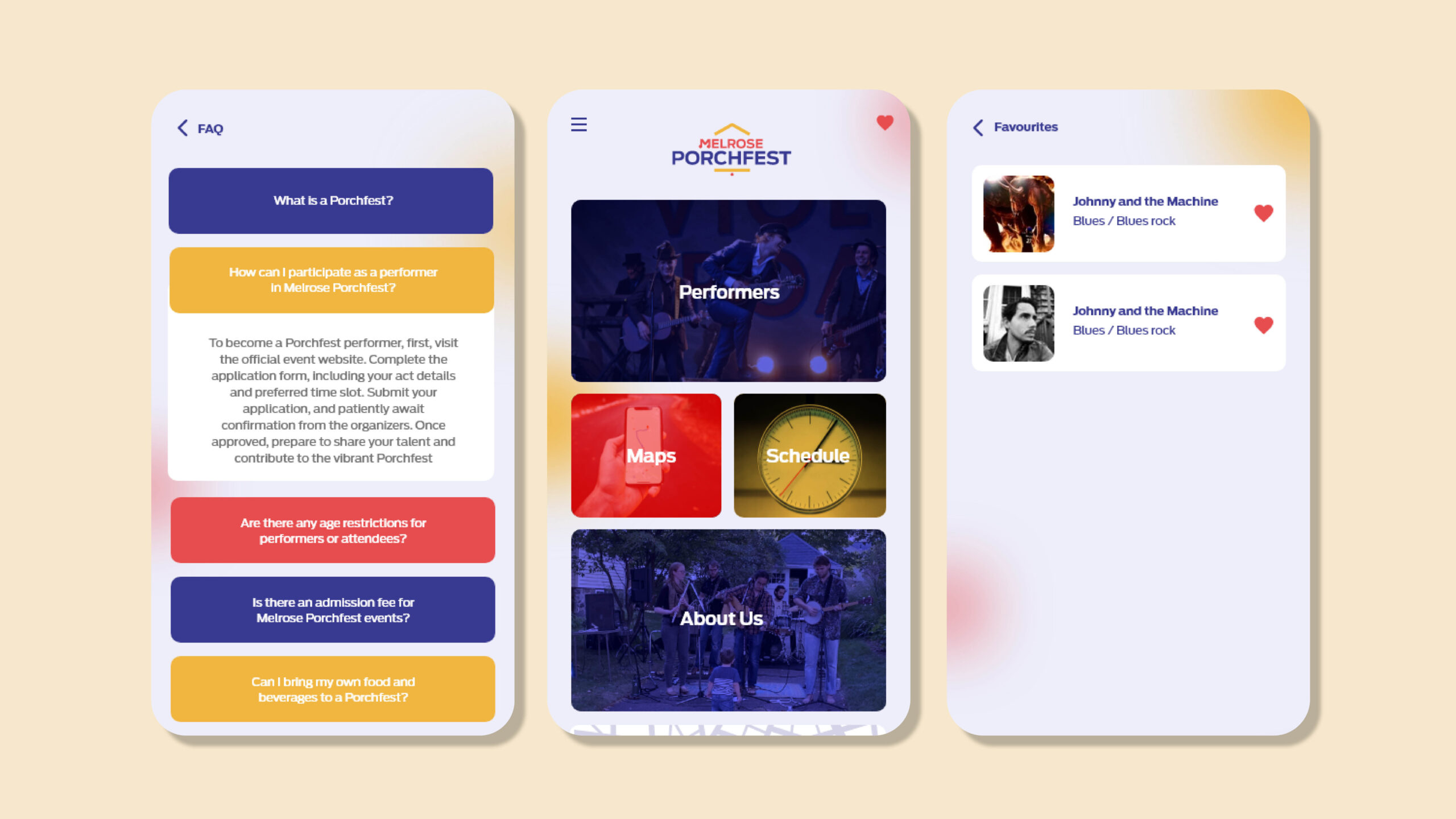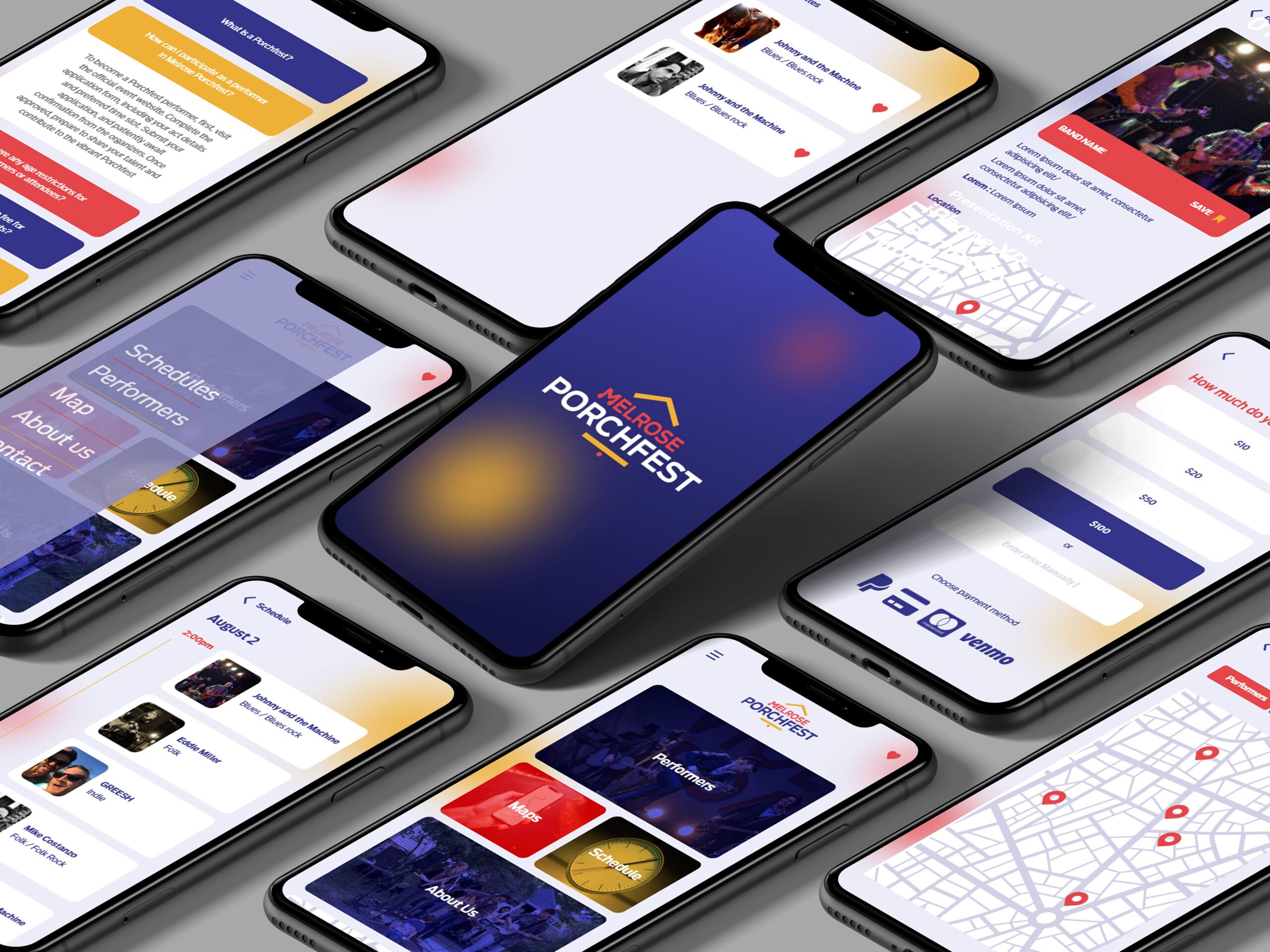 Melrose Porchfest is an annual festival in Melrose, Massachusetts, where residents host bands, artists, and musicians on their porches for a day of performances. My app concept for Melrose Porchfest aims to enhance attendees’ experience by providing a customizable schedule builder, a map for personalized routes, band information with timings and locations, and a Q&A section, making navigation and planning seamless and enjoyable.